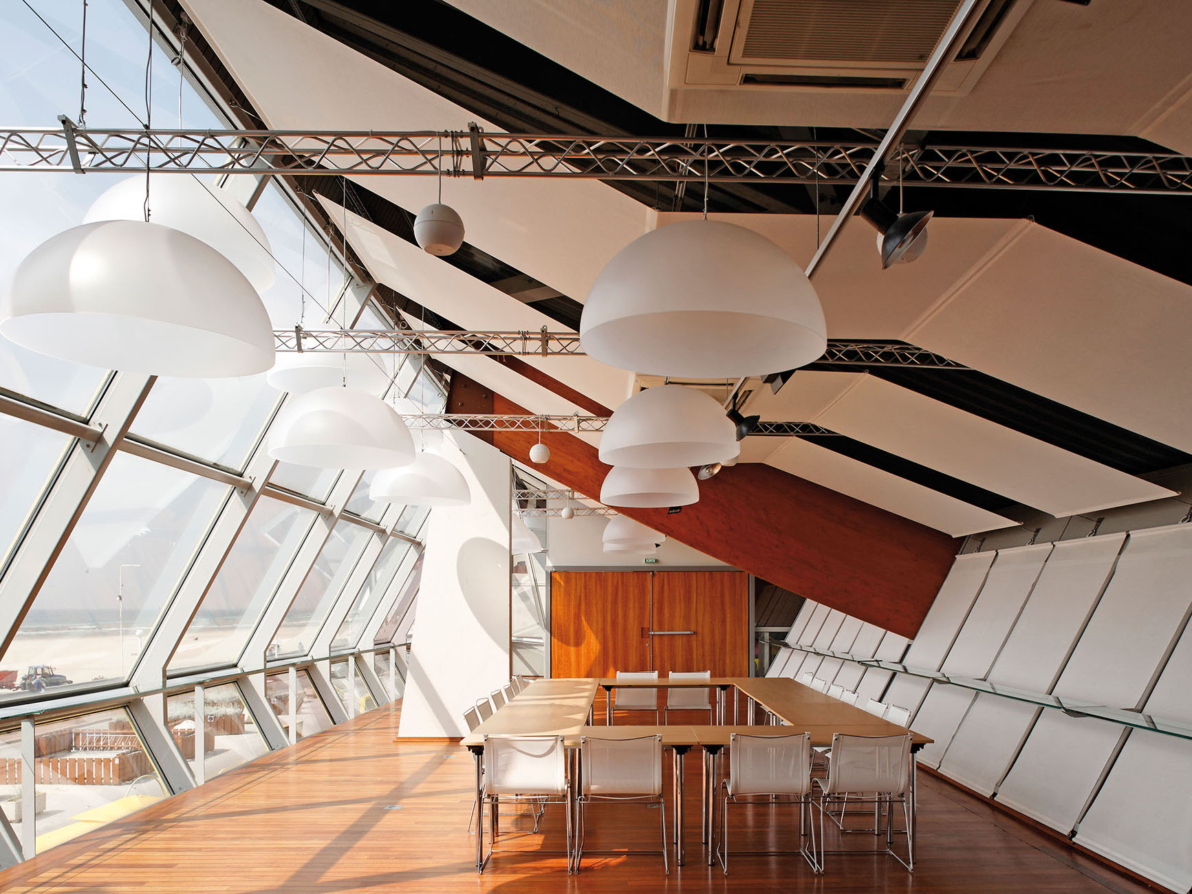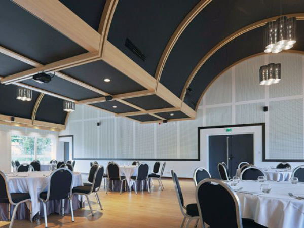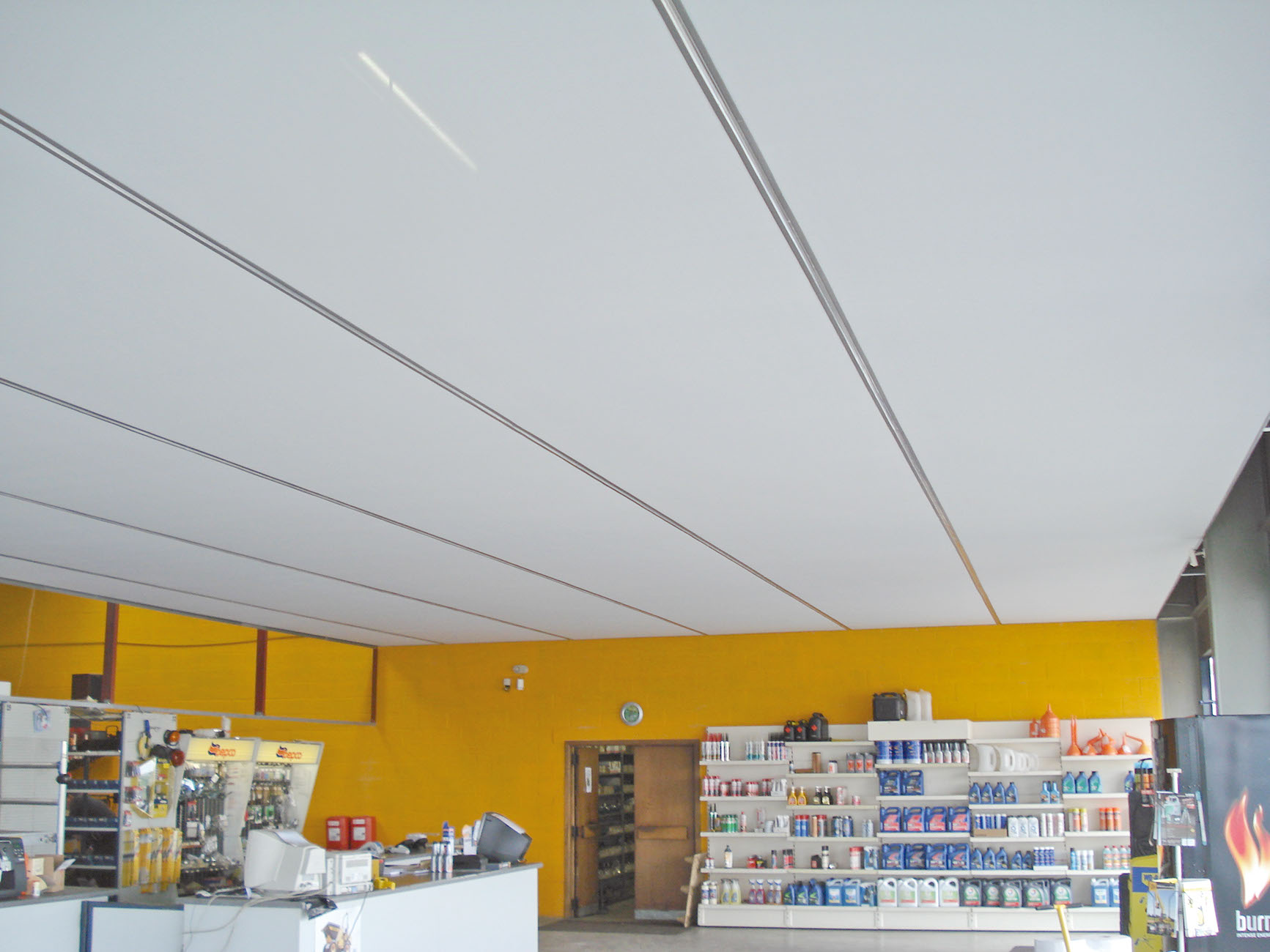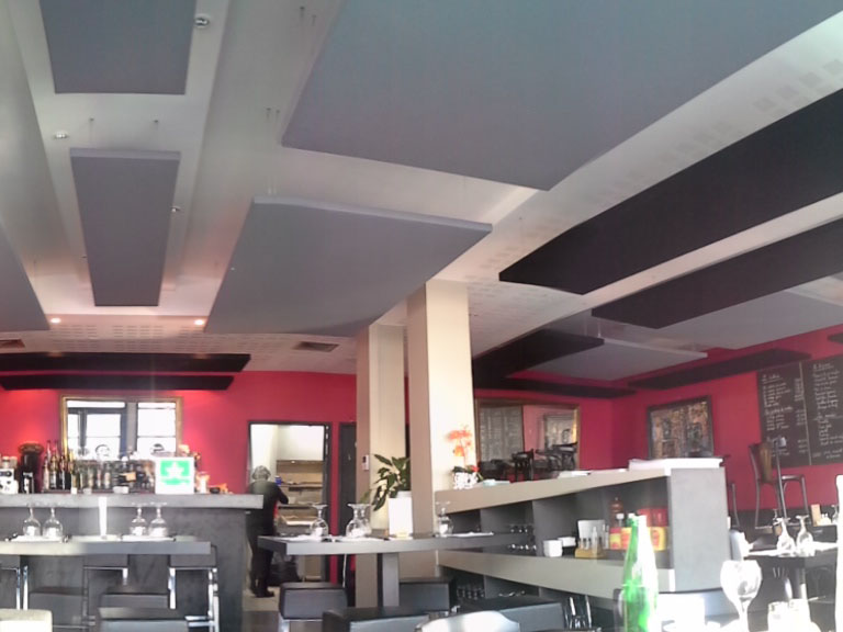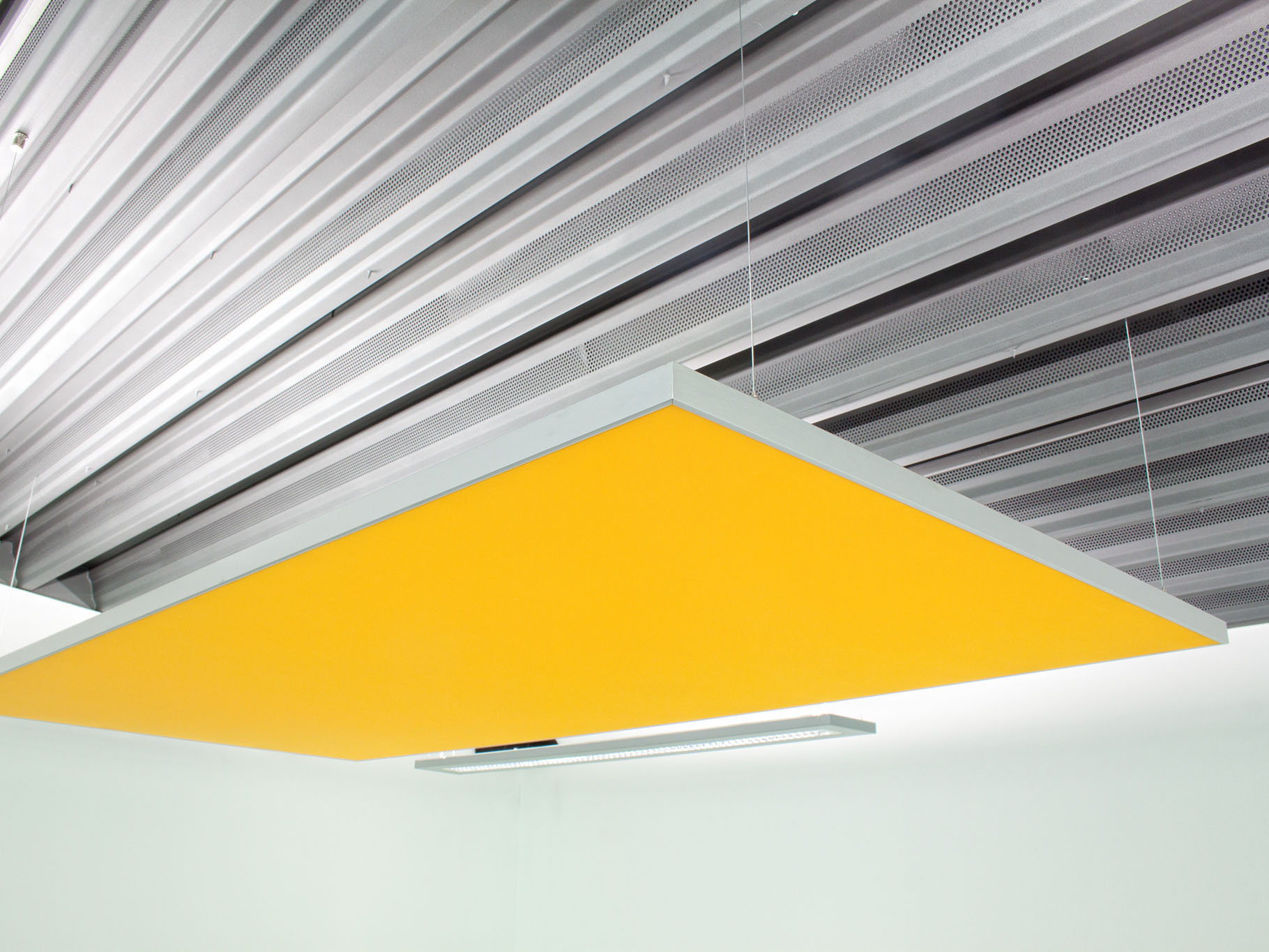 - flacher Schallabsorber zur erheblichen Reduktion von Nachhallzeit und Lärmpegel